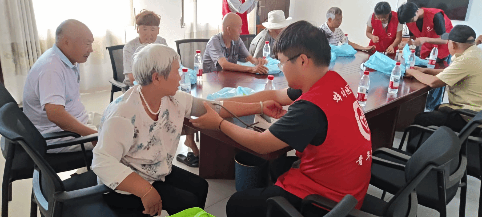 7月11日,晨光熹微中,团队抵达谯城区光荣院。在这里,杨万林、杨志田两位老兵,成为了鲜活的“历史教科书”。老人们将战火中的冲锋、和平年代的坚守娓娓道来。小队成员们围坐倾听,历史在此刻不再是铅字,化作血脉中的共鸣,红色基因如春雨,悄然浸润青春土壤。当听诊器轻贴胸膛,血压计数值平稳跳动,专业的健康检查与贴心的用药指导,让“守护”二字有了最实在的模样,为长者的健康之路点亮微灯。