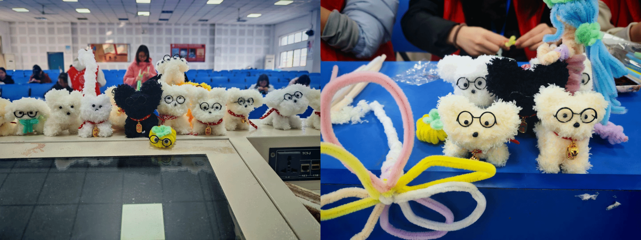 制作过程中,同学们充分发挥奇思妙想。普通的扭扭棒在同学们手中弯折、缠绕、组合、幻化出各式各样的创意作品:萌趣的小动物、缤纷的花卉、可爱的南瓜、精致的雪花,大家相互交流技巧,分享灵感。这不仅仅是一次手工体验,更成为同学们放松身心、展示个性的欢乐聚会。