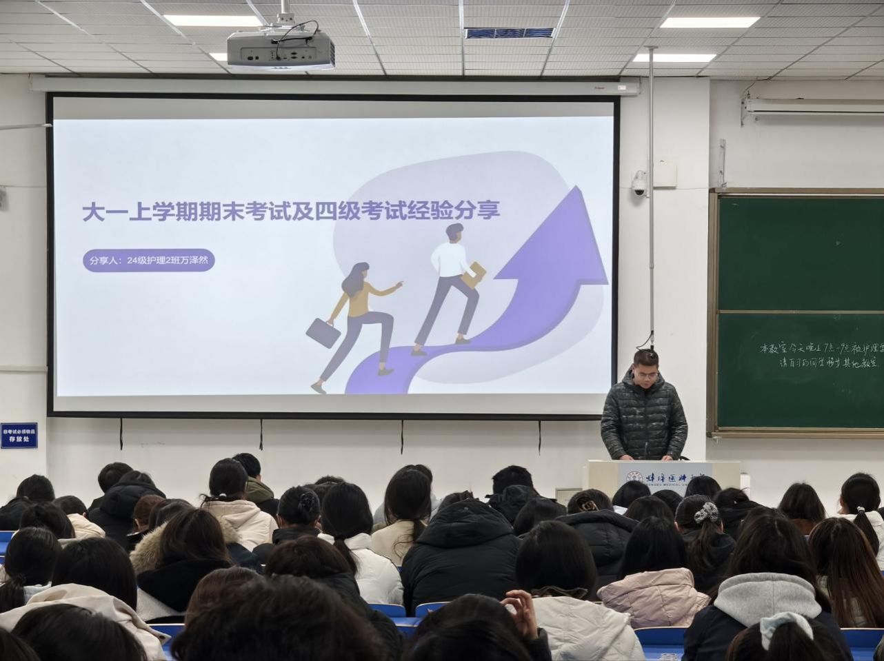 为帮助新生高效备考英语四级与期末考试,缓解压力、掌握科学方法,护理学院于12月5日晚在G3教室举办经验交流分享会。会议由学习实践部左宁宁主持,全体新生积极参与。