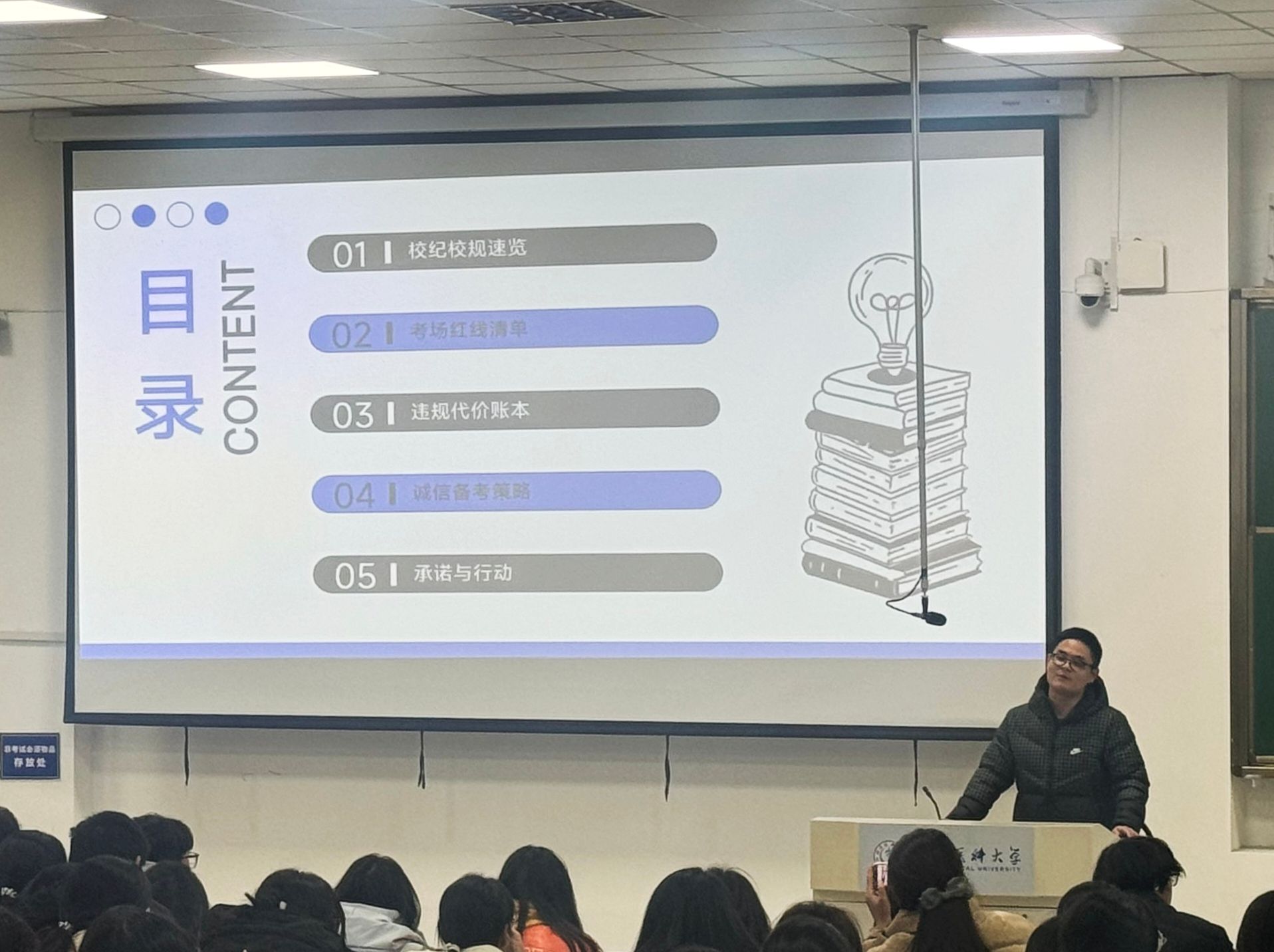 会议分为四个环节。张礼老师首先就考风考纪与诚信应考进行强调。随后,四位24级优秀学长学姐依次登台,围绕时间规划、题型突破、记忆技巧、心态调整等方面展开分享,为25级同学提供实用备考建议。最后,学生会主席团万泽然同学进行总结,并祝愿新生在考试中取得优异成绩。