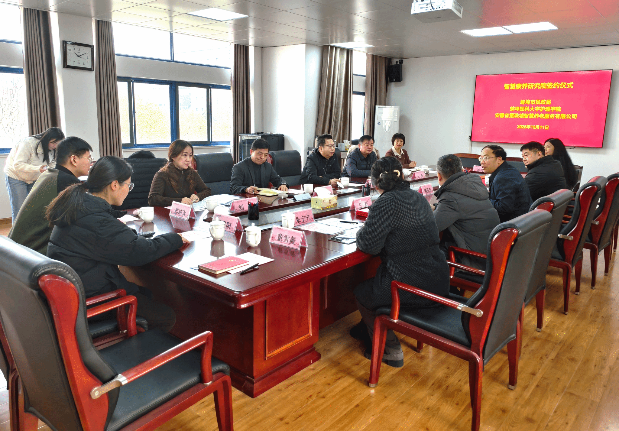 蚌埠市民政局作为政策指导与资源协调方,长期致力于推进智慧养老体系建设,在社区居家养老、医养结合及养老数字化方面积累了丰富的改革经验,能够为研究院提供政策引导、区域规划与治理协同支持。护理学院依托学科专业优势,拥有扎实的科研基础与人才培养体系,已有健康小屋示范场景建设、产业学院共建、养老相关职业技能等级认定等方面的基础,可支持在智慧康养领域开展前沿研究、课程开发与专业培训,并为行业输送高素质专业人才。安徽省慧珠城智慧养老服务有限公司则发挥其在智慧养老平台建设、信息化运营及服务场景落地方面的实践经验,致力于拓展“互联网+护理服务”等应用,促进科研成果转化,助力构建覆盖机构、社区、家庭的康养服务网络。