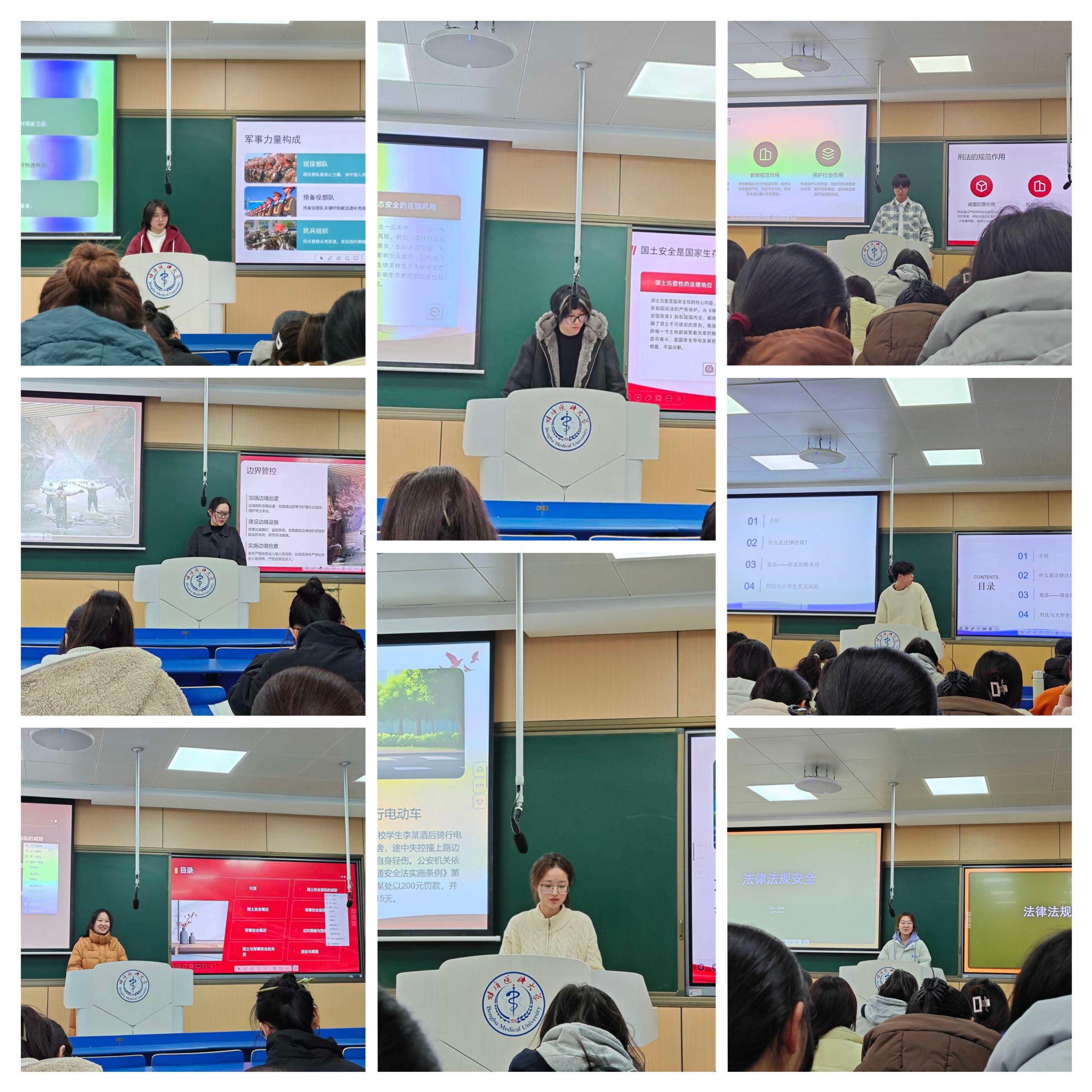 文以载道,安以固邦。为深化校园安全文化建设,筑牢思想与行动的双重防线,护理学院2024年级于12月8日、9日、15日、16日组织护理学、助产学各班开展“知险防险,会讲会干”安全知识宣讲活动。活动围绕“法律法规安全”“国土与军事安全”两大核心主题,贯穿法律准则、国家安全要义与校纪校规,着力为青年学子筑牢安全成长的坚实屏障。