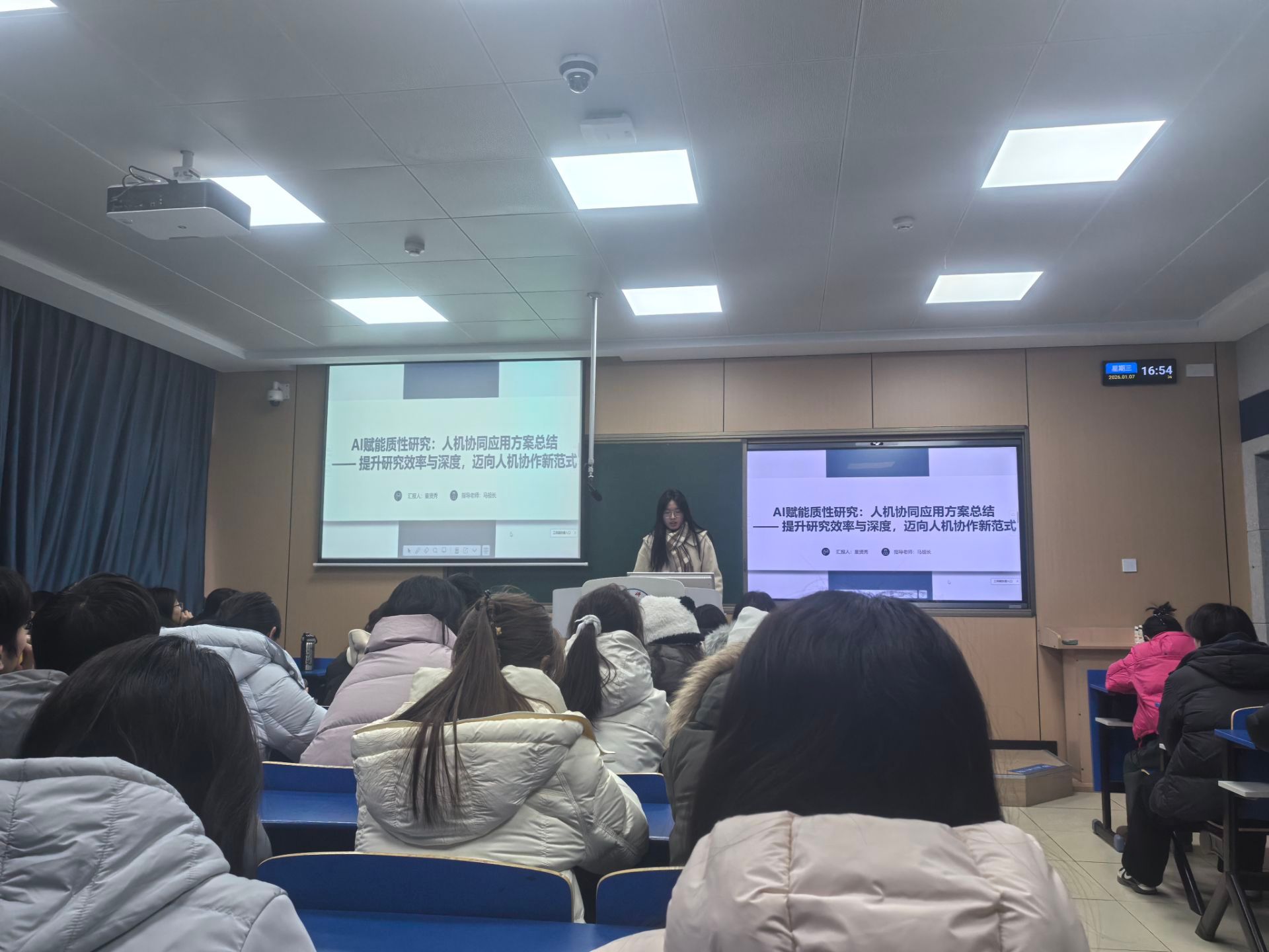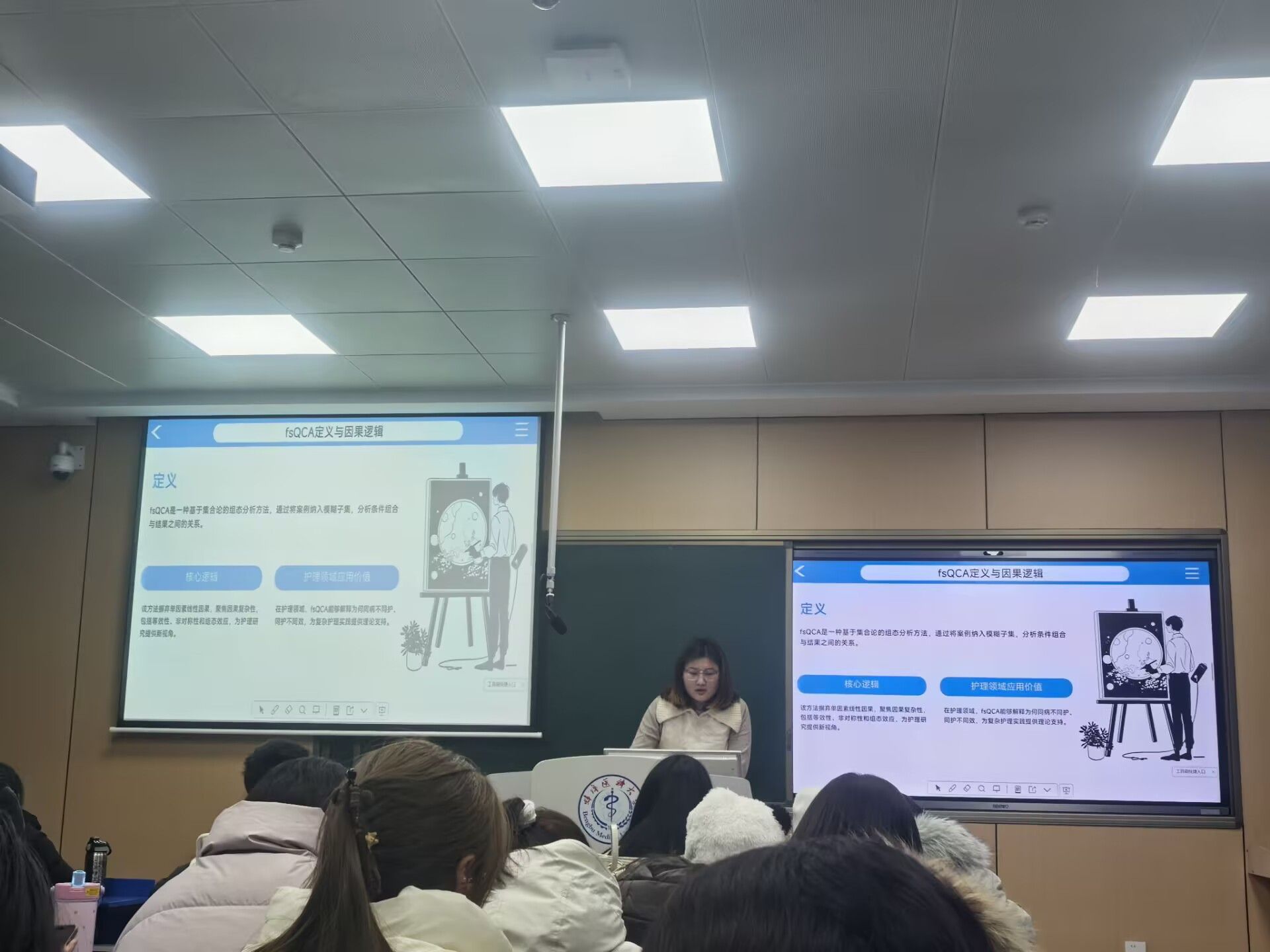 此外,25级专硕童贤秀探讨了《AI 赋能质性研究:人机协同应用方案》,提出“AI辅助初筛+人工深化分析”的协同模式;许千慧通过视频演示semantic scholar软件在文献追踪中的实际应用;周茜以肿瘤患者照护体验为例,讲解NVivo在访谈文本编码、节点构建与主题提炼中的操作步骤;武双对比分析了APA、GB/T 7714等常见文献引用规范的适用场景;徐周华则介绍了fsQCA组态分析方法在护理干预效果影响因素研究中的应用逻辑。