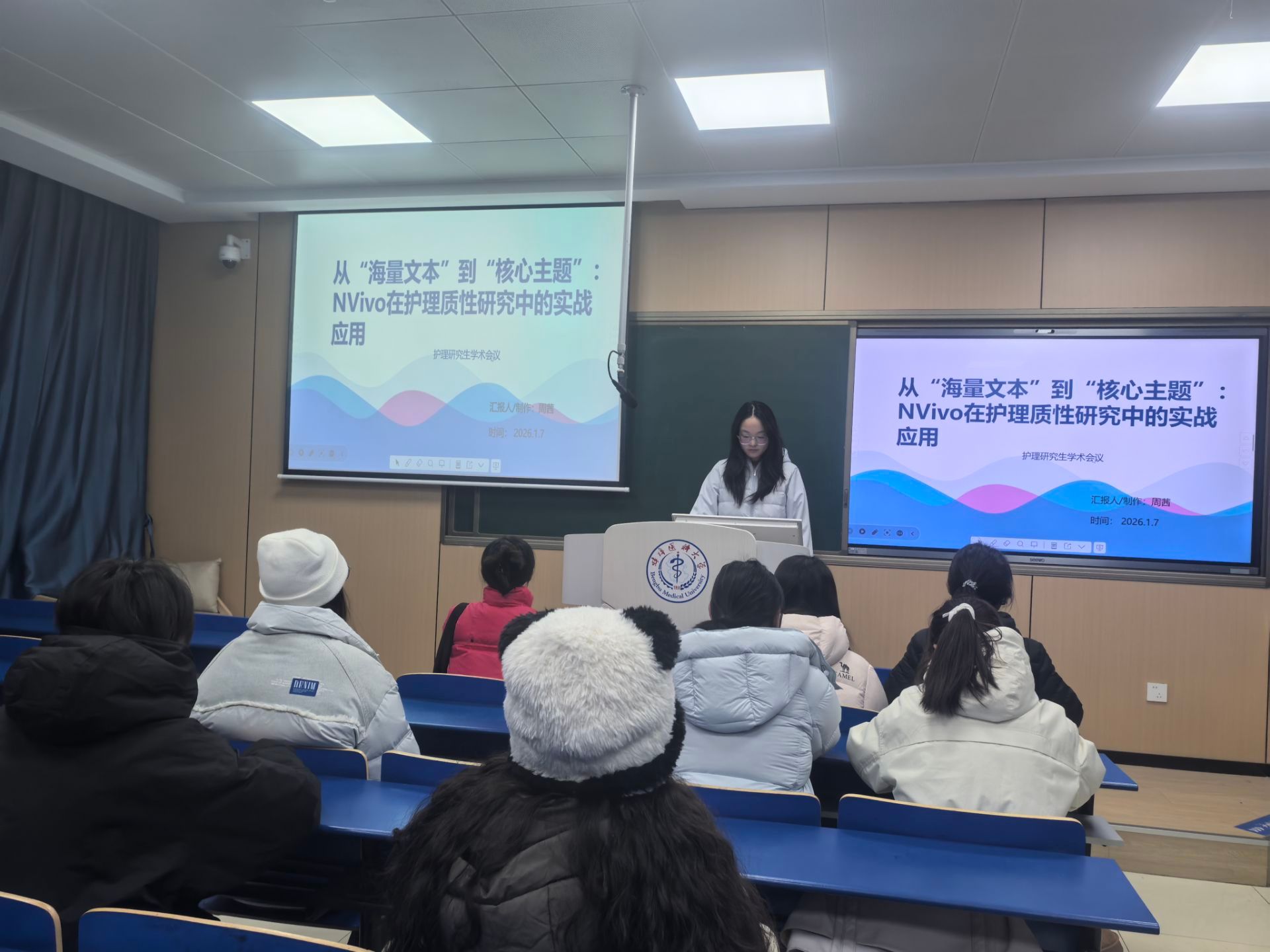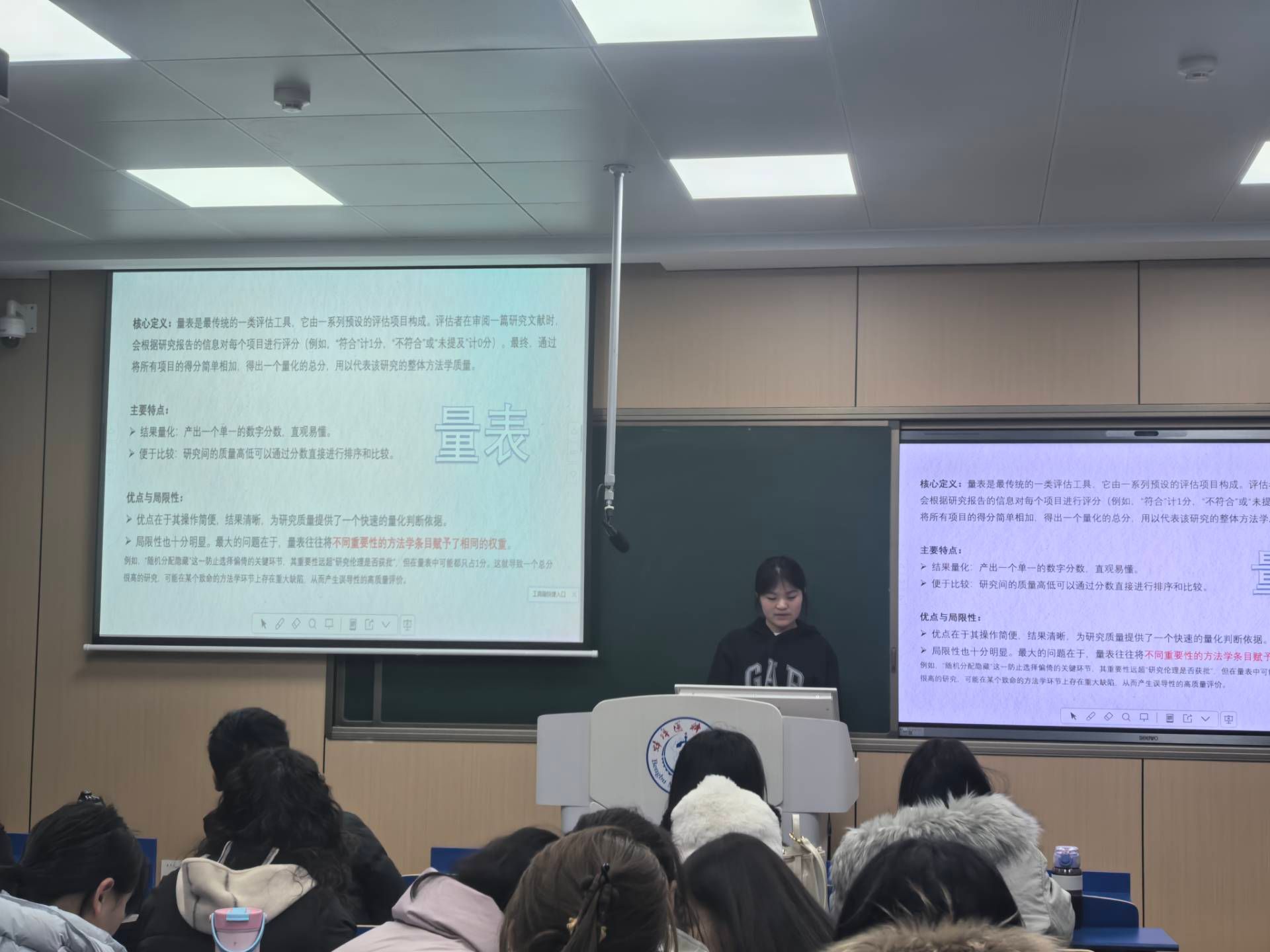 2026年1月7日下午,护理学院在理论楼112教室举办了研究生科研沙龙,沙龙内容紧扣护理研究生的科研实际需求,融入“方法解析+案例演示+实操技巧”,将抽象的科研方法转化为可操作的实际技能。在分享环节中,多位同学结合自身研究经验进行了专题汇报: