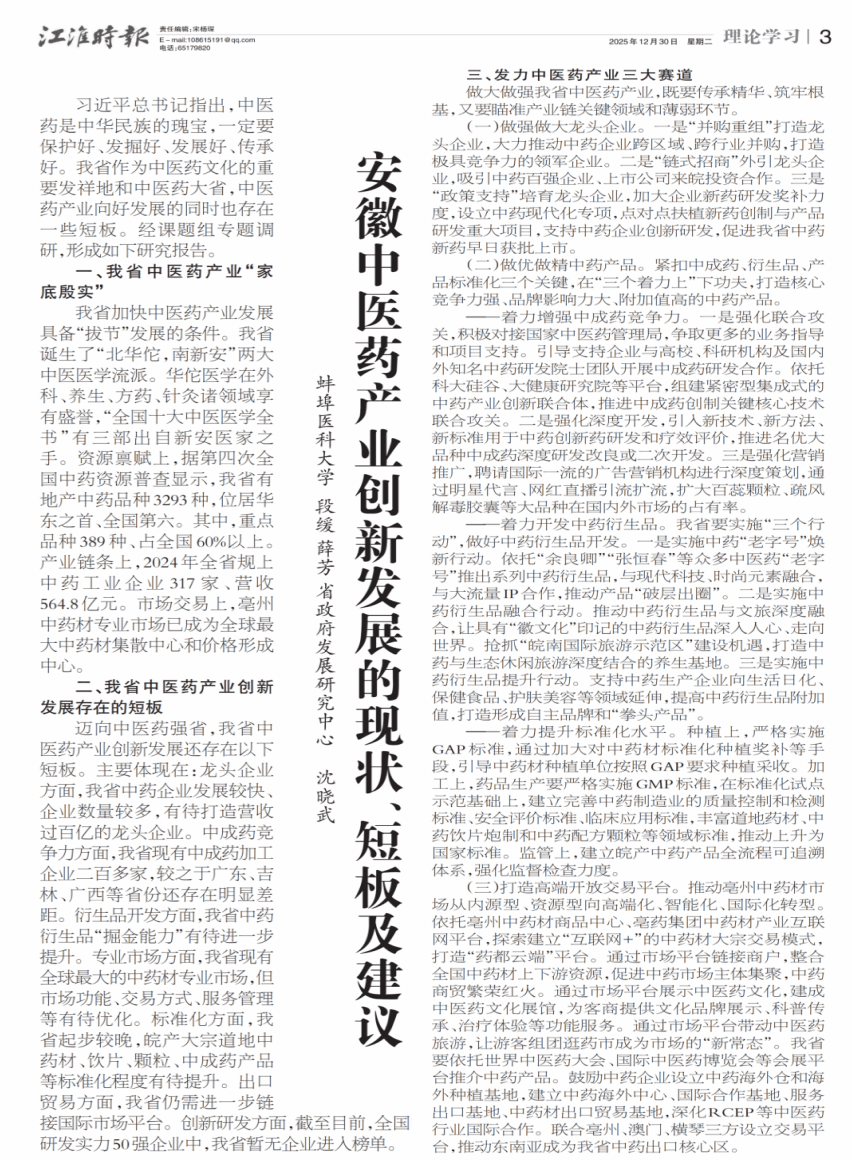 近日,我校护理学院段缓团队撰写的咨政报告《安徽中医药产业创新发展的现状、短板及建议》在省级主流理论与决策咨询媒体《江淮时报》刊发,并被相关决策部门采纳。该报告以作者署名形式发表,署名单位包括安徽省人民政府发展研究中心,体现了我校在健康与中医药政策研究领域的积极参与和智库作用。