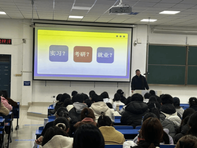 学院党委书记吴涛就规划好实习、考研及就业三者之间的关系作专题交流。同时,结合当前就业形势与鲜活实际案例,深入浅出地剖析了职业发展路径,引导广大学子树立科学理性的就业观。他特别强调,面对激烈的竞争环境,同学们应摒弃“一步到位”的择业误区,确立“先就业、再择业”的务实理念,在实践中积累经验、磨砺成长。此外,针对实习求职高峰期可能产生的焦虑情绪,吴涛书记叮嘱大家要高度重视心理健康,学会自我调适,以积极乐观的心态迎接挑战。他鼓励同学们坚定信心,主动出击,将个人理想融入国家发展大局,努力在奋斗中实现人生价值。此次分享为处于迷茫期的学子指明了方向,注入了强劲动力。